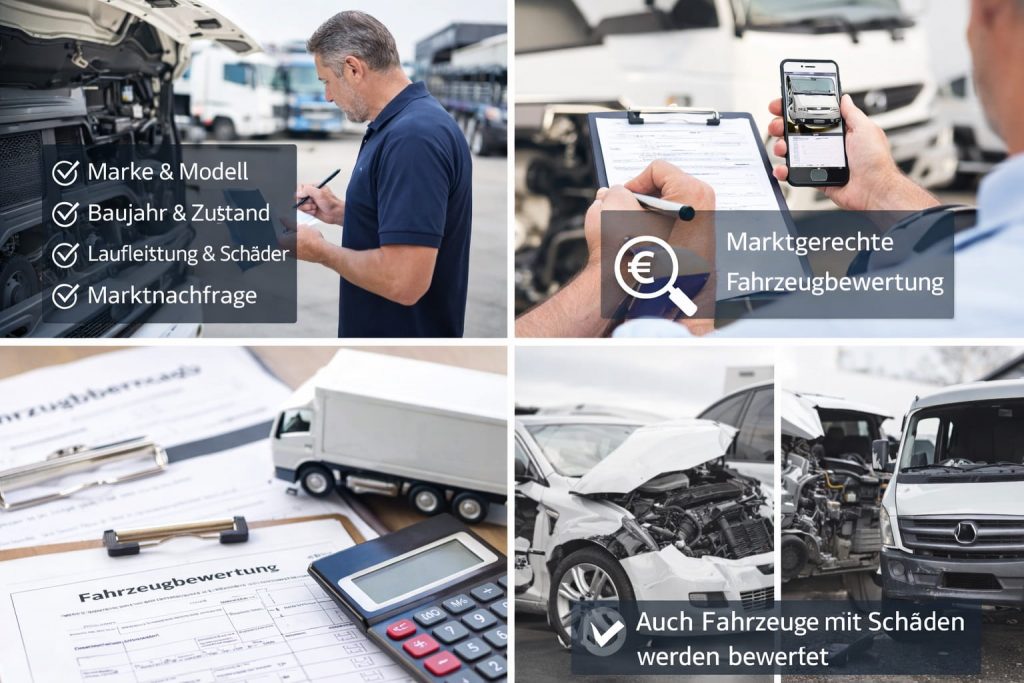 Unsere Bewertung erfolgt unverbindlich und basiert auf aktuellen Marktdaten. So erhalten Sie eine transparente und faire Preiseinschätzung für Ihren LKW oder PKW.